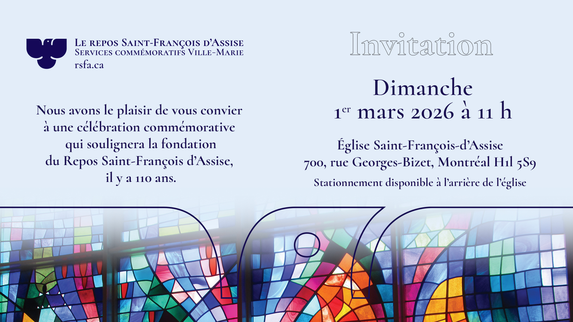 Nous avons le plaisir de vous convier à une célébration commémorative qui soulignera la fondation du Repos Saint-François d’Assise, il y a 110 ans.